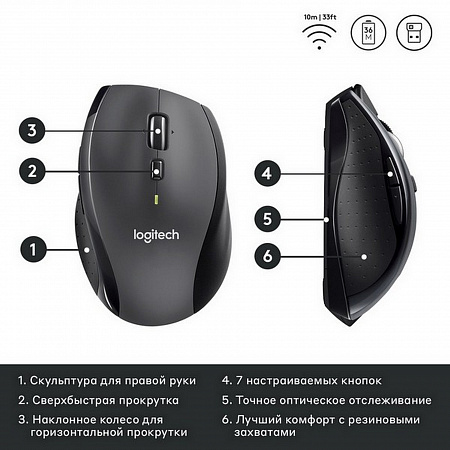 Точное управление курсором Функция оптического отслеживания от Logitech обеспечивает точное управление курсором (1000 точек на дюйм) и плавное передвижение по большинству видов поверхностей. |
