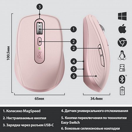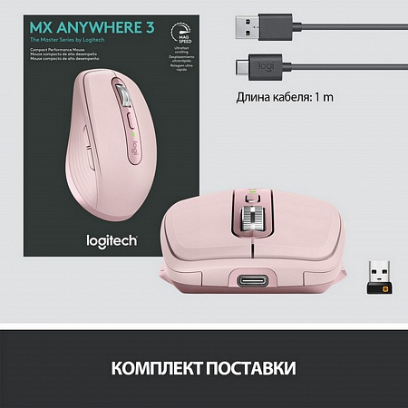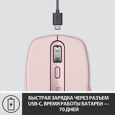 При полностью заряженной батарее мышь MX Anywhere 3 может проработать до 70 дней, а быстрой зарядки в течение одной минуты хватит на три часа работы. Для подзарядки используется кабель USB-C из комплекта поставки.