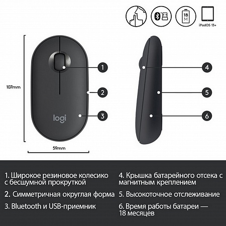 Подключайтесь к компьютеру, ноутбуку или планшету с помощью интерфейса Bluetooth либо миниатюрного USB-приемника, хранящегося под магнитной крышкой мыши, и работайте в свое удовольствие: качество связи с радиусом действия до 10 метров исключает возникновение перебоев и задержек. Радиус действия беспроводной связи зависит от окружающих условий и конфигурации компьютера.. Поддерживаются операционные системы Windows, macOS, Chrome OS и iPadOS.