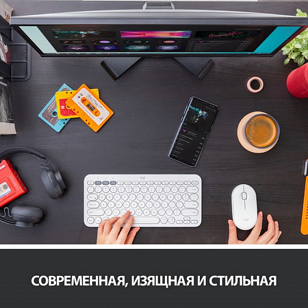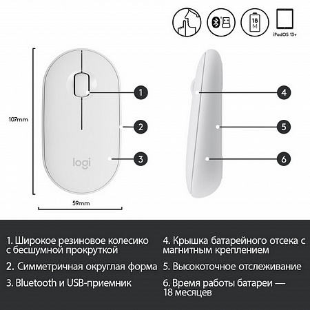 Подключайтесь к компьютеру, ноутбуку или планшету с помощью интерфейса Bluetooth либо миниатюрного USB-приемника, хранящегося под магнитной крышкой мыши, и работайте в свое удовольствие: качество связи с радиусом действия до 10 метров исключает возникновение перебоев и задержек. Радиус действия беспроводной связи зависит от окружающих условий и конфигурации компьютера.. Поддерживаются операционные системы Windows, macOS, Chrome OS и iPadOS.