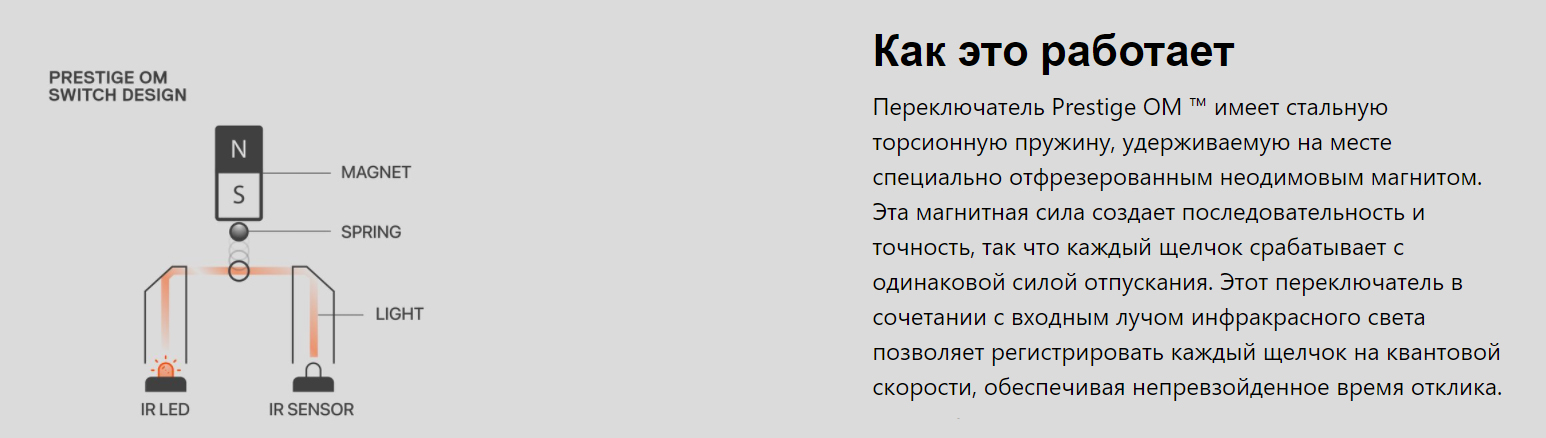 Уникальный дизайн Prestige OM Switch создан для интенсивной игры на профессиональном уровне. Эти переключатели, в которых используются неодимовые магниты для обеспечения наиболее стабильных щелчков мышью, рассчитаны на 100 миллионов щелчков, что является лучшим в своем классе в отрасли. Переключатель Prestige OM также использует инфракрасный световой луч, чтобы обеспечить молниеносное время отклика в игре.