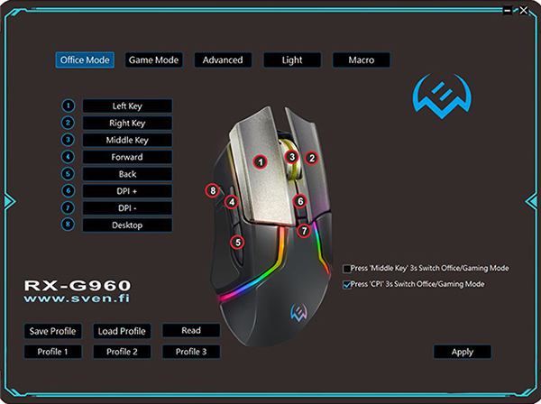 Найдите свой путь в мир высоких игровых технологий вместе с мышью RX-G960 от SVEN, вобравшей в себя самые передовые и актуальные решения, доступные сегодня производителям периферии для гейминга. Разрешение ее сенсора гибко настраивается и достигает внушительных 6400 DPI — хватит для любых дисплеев и игровых жанров. С RX-G960 вы всегда сможете найти лучший баланс скорости и точности управления.