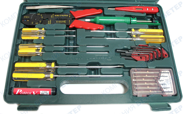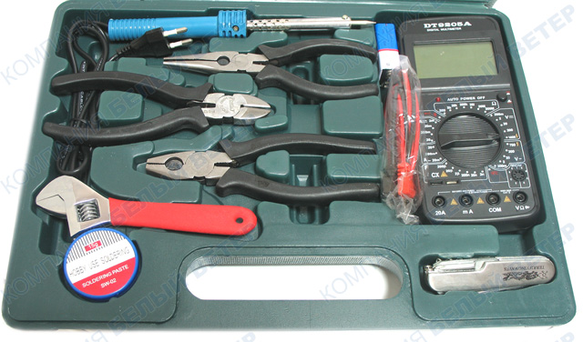 Набор инструментов для прокладки электрических или автомобильных сетей Комплектация: 1. Набор отвёрток с удлинённым жалом 8 шт. 2. Набор отвёрток для мелких работ 6 шт. 3. Набор шестигранников. 8 шт. 4. Инструмент для обрезки кабеля и снятия изоляции. 5. Инструмент для поиска проводника в стене. 6. Отсос припоя. 7. Олово. 8. Паяльник. 9. Набор плоскогубцев 3 шт. 10. Разводной ключ. 11. Мультиметр универсальный. 12. Солидол. 13. Ножик складной многофункциональный.