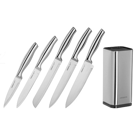 Набор состоит из пяти ножей серии Gemini, в который входят два поварских ножа, нож универсальный, нож для хлеба и нож для овощей. Лезвия и ручки изготовлены из нержавеющей стали.