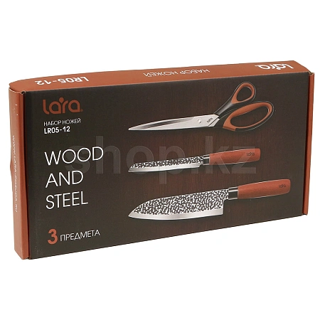 В наборе ножей LARA собраны качественные инструменты, с помощью которых вы без труда разделаете мясо или нашинкуете овощи. В комплект входят ножницы с удобными прорезиненными ручками и два вида ножей: сантоку и универсальный. Набор упакован в подарочную коробку. Рекомендуется ручная мойка. Все ножи выполнены из высокоуглеродистой нержавеющей стали 3Cr14. Финишная отделка клинка имеет специальное антиналипающее покрытие. Выемки на лезвии создают воздушную прослойку при резке. Лезвие с идеальной заточкой режущей кромки долгое время остается острым. Удобная рукоять из темной древесины со стальным черным больстером придает дизайну ножа завершенный вид.