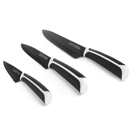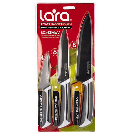В наборе ножей LARA собраны три самых популярных ножа: универсальный, для нарезки и поварской. Набор позволит укомплектовать любую кухню отличными инструментами для разделки и переработки различных продуктов. Приготовление станет в радость! Клинок каждого ножа изготовлен из высокоуглеродистой нержавеющей стали марки 3Cr13 с черным матовым керамическим покрытием, которое не подвержено образованию коррозии. Надежная прорезиненная рукоять удобно лежит в руке, поэтому нож не выскользнет во время работы. Лезвие с идеальной заточкой режущей кромки долго останется острым. Рекомендуется ручная мойка.