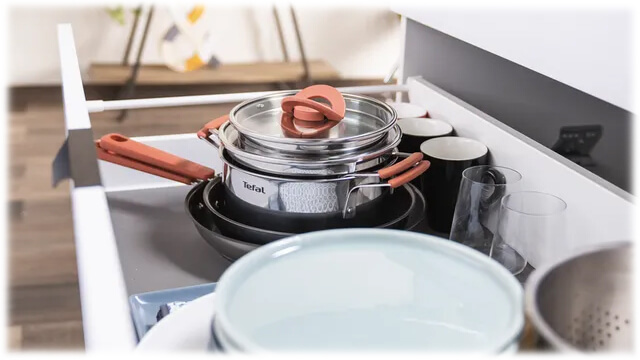 Ручки посуды не выскальзывают и не нагреваются во время приготовления, а на внутренней поверхности стенки расположена удобная мерная шкала, которая помогает точно измерять количество жидкости внутри. С набором OPTI'Space на вашей кухне появится больше свободного места!