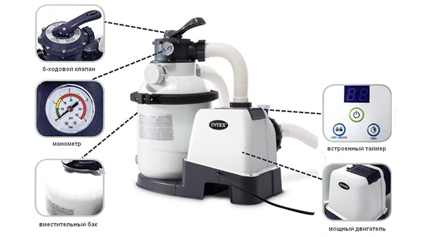 Насос имеет 6 режимов работы и встроенный 24-часовой таймер, подключается к штатным отверстиям бассейна при помощи двух гофрированных шлангов.