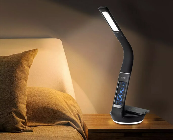 Настольная лампа КТ-3329 - эргономичная светодиодная лампа с беспроводной зарядкой для мобильных устройств, часами и подсветкой, которая отлично подойдёт для освещения рабочего пространства дома или в офисе, выполнения бытовых задач.