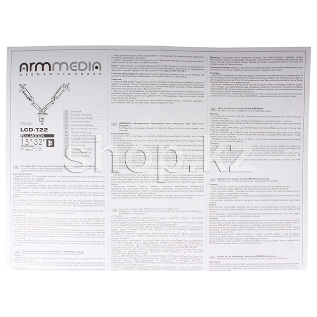 Arm Media LCD-T22 - позволяет регулировать каждый экран так, как вам необходимо. Мониторы на кронштейнах можно поворачивать вокруг своей оси на 360°, наклонять вверх и вниз, придвигать или удалять от себя. Встроенная газовая пружина обеспечивает плавное и лёгкое движение экрана вверх и вниз в пределах 325 мм, а также фиксацию монитора в любом промежуточном положении.
