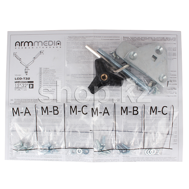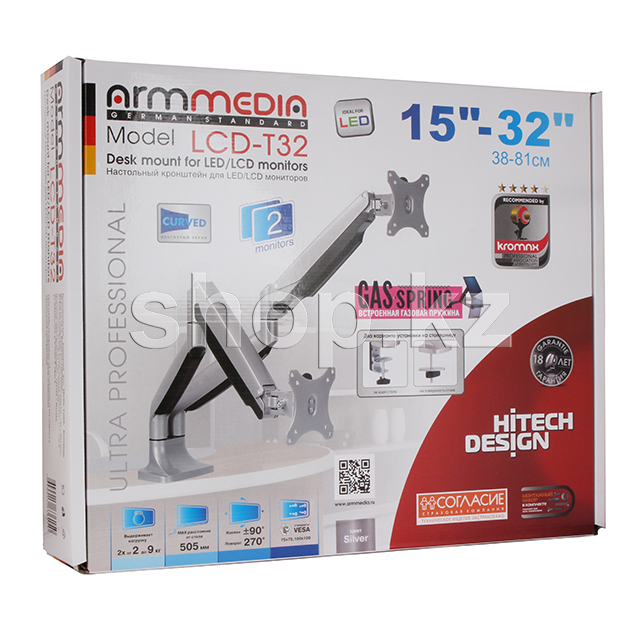 Arm Media LCD - T32-тәуелсіз реттелетін екі мониторға арналған үстел үсті, көлбеу айналмалы кронштейн. Кіріктірілген газ серіппесі экранның жоғары және төмен тегіс және жеңіл қозғалысын, сондай-ақ мониторды бекітуді қамтамасыз етеді.