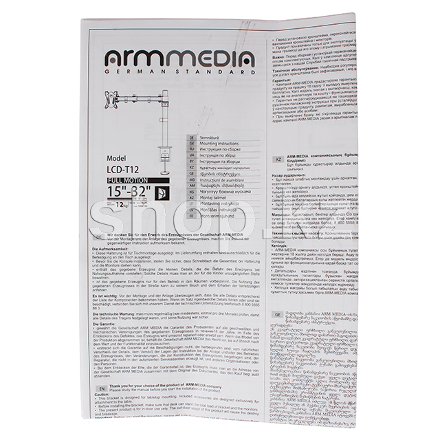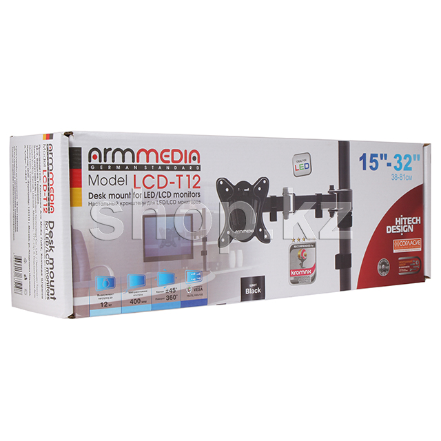 Кронштейн для мониторов ARM MEDIA LCD-T12 – это универсальный настольный крепеж для большинства моделей от 15 до 32 дюймов (от 38 до 81 см). Кронштейн ARM MEDIA LCD-T12 позволяет устанавливать экран в удобное положение, он свободно двигается в разных направлениях, его можно наклонять, поворачивать вокруг штанги, изменять вылет и регулировать высоту установки экрана над столом. Высота штанги 40 см. Кронштейн ARM MEDIA LCD-T12 рассчитан на максимальную нагрузку до 12 кг. Легкая установка и регулировка. Имеются специальные зажимы для проводов. В комплекте монтажный набор для крепления монитора.
