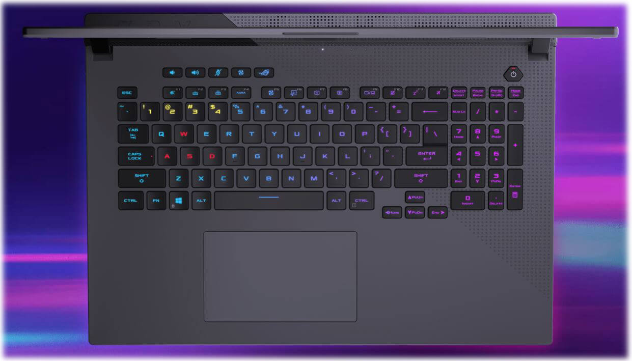 Приглушите свет – и этот ноутбук станет центром всеобщего внимания благодаря красочной подсветке Aura, просачивающейся сквозь прозрачные грани клавиш. Ее дополняет световая полоска, обрамляющая внешние грани корпуса. Опционально поддерживается поклавишная настройка подсветки, что позволяет выделять важные клавиатурные сочетания. Цвет и визуальные эффекты могут синхронизироваться с подсветкой других Aura-совместимых устройств (технология Aura Sync) или привязываться к внутриигровым событиям.