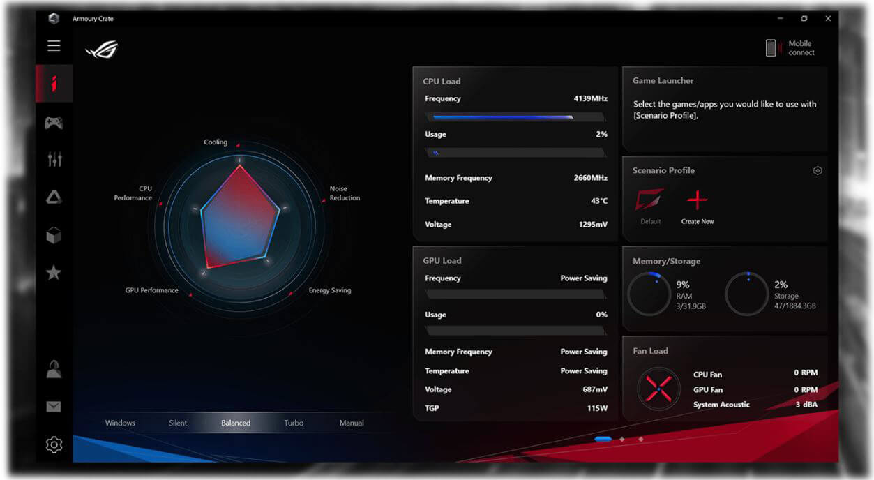 Приложение ROG Armoury Crate представляет собой единый программный центр управления ноутбуком. С его помощью можно задать системные параметры, отрегулировать работу подсветки и даже создать профили с настройками, которые будут автоматически применяться при запуске определенных программ.