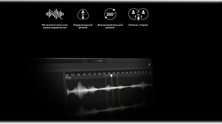 Встроенный микрофонный массив может работать в трех разных режимах. В кардиоидном звук в основном захватывается непосредственно спереди ноутбука, что необходимо при стриминге и в играх. В режиме стерео применяется разделение на правый и левый каналы с целью получения более широкой звуковой панорамы, например при записи исполняемой вживую музыки. Всенаправленный режим, предназначенный для групповой конференц-связи, служит для равномерного захвата звуков со всех сторон.