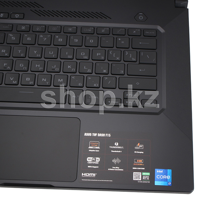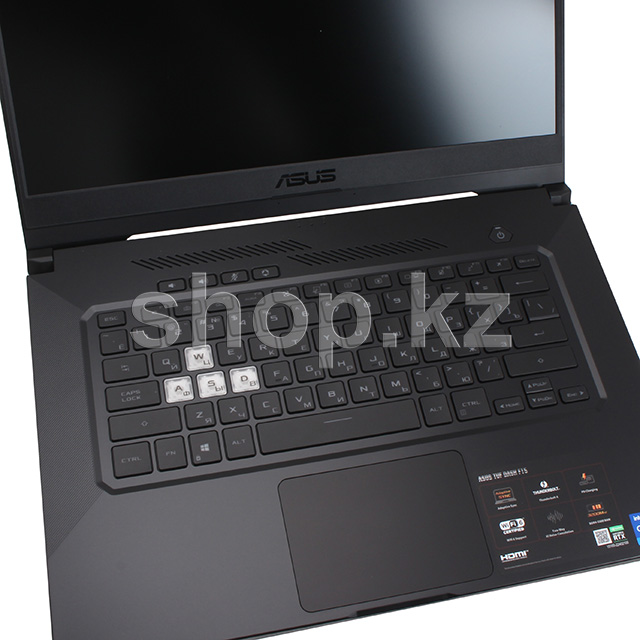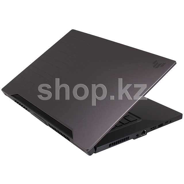 TUF DASH F15 ноутбугы жұқа (19.9 мм) корпуста қысқа дизайнмен жасалған. Нақтылау тақырыбын тар экран жақтауы жалғастырады, ол көріністі кескіннен мүлдем алшақтатпайды. Жаңартылған дизайн TUF классикалық құндылықтарына ешқандай зиян келтірмейді: басқа модельдер сияқты, TUF Dash F15 MIL-STD әскери-өнеркәсіптік стандартына сәйкес тексерілген ерекше беріктікке ие.