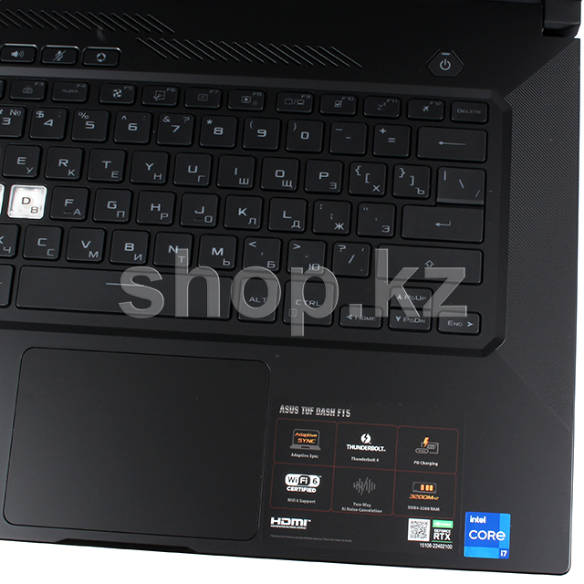 Ноутбук TUF Dash F15 предлагает большое число интерфейсов для всевозможной периферии, среди которых три высокоскоростных порта USB 3.2 Type-A и универсальный Thunderbolt 4. Для подключения пары внешних мониторов можно воспользоваться интерфейсами HDMI 2.0b и DisplayPort 1.4 (через разъем USB-C).