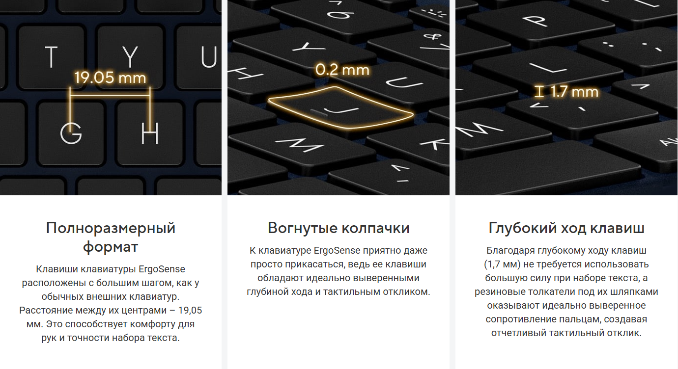 К клавиатуре ErgoSense приятно даже просто прикасаться, ведь ее клавиши обладают идеально выверенными глубиной хода и тактильным откликом. Кроме того, она очень тихо работает.