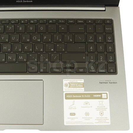 Кез-келген мазмұн Zenbook 15 OLED ноутбугында түрлі – түсті көрінеді, өйткені ол 2,8 k ажыратымдылығы бар 16:9 жоғары сапалы OLED дисплейімен жабдықталған, жұқа экран жақтауы бүкіл құрылғыныңностиамдылығына ықпал етеді-экранның салыстырмалы өлшемі 86% құрайды. Дисплей терең қара контрастпен (Displayhdr True Black 600 сертификаты) және Pantone Validated сертификатымен расталған дәл түспен мақтана алады. Оның эргономикасы, соның ішінде шығарылатын көк жарықтың төмен деңгейі SGS және TÜV Rheinland зертханаларымен сертификатталған.