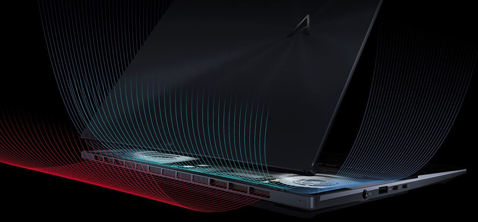 При открытии крышки ноутбука задняя часть клавиатуры автоматически приподнимается под углом в 7°, комфортным для набора текста. При этом открывается вентиляционное отверстие шириной до 14,5 мм. Эта активная аэродинамическая система под названием AAS Ultra усиливает воздушный поток на 30%, что способствует снижению температуры поверхности корпуса на величину до 7°C.