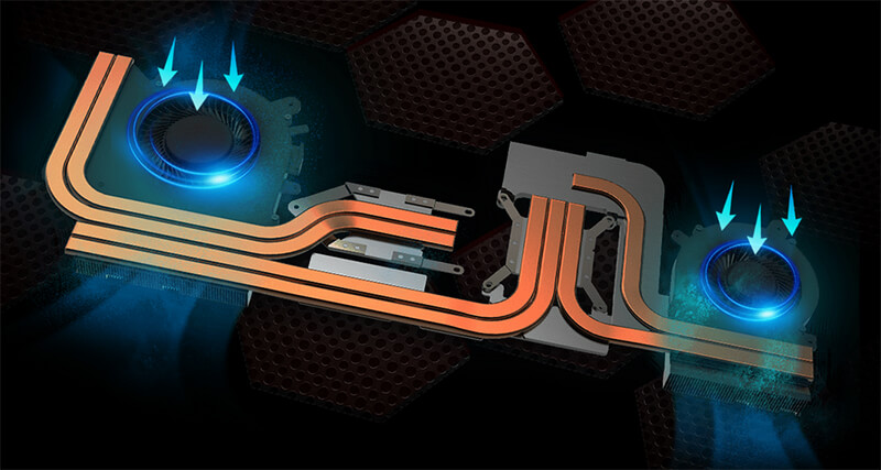 В системе охлаждения используется до 6 тепловых трубок с увеличенным диаметром и раздельные термомодули для центрального и графического процессоров с эксклюзивным термоинтерфейсом. Все это способствует стабильной работе устройства под экстремальными игровыми нагрузками.