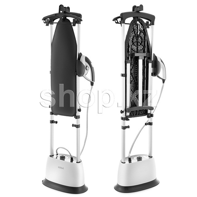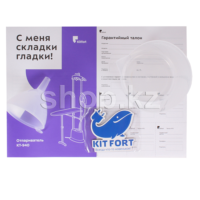Отпариватель Kitfort КТ-940 своей конструкцией похож на паровую станцию и пароочиститель. Вода нагревается в бойлере и под давлением в 4 бара подается в утюжок с антипригарным покрытием. Встроенный подогреватель нагревает подошву утюжка до температуры 100–130 °С.
