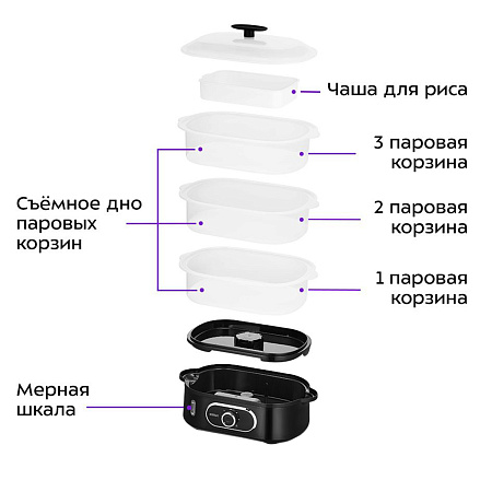 Паровые корзины имеют разный объем и должны устанавливаться в определенном порядке. Номер корзины указан на ручке. 1 корзина (3,7 л) устанавливается на поддон, затем на 1 корзину устанавливается 2 корзина (4 л), затем на 2 корзину идёт 3 корзина (4,3 л).