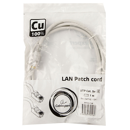 Patch cord RJ-45 5е cat Cablexpert PP10-1M, UTP, 1m, Gray