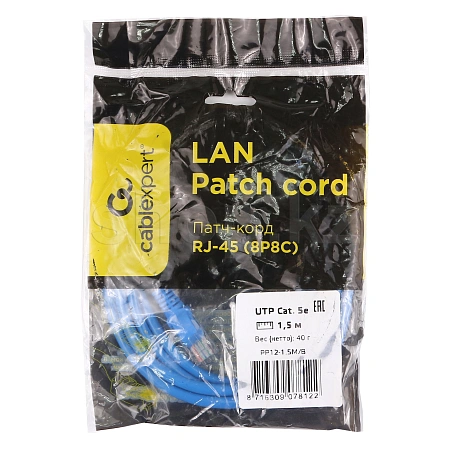 Patch cord RJ-45 5е cat Cablexpert PP12-1.5M/B, UTP, 1.5m, Blue