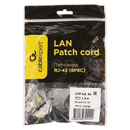 Patch cord RJ-45 5е cat Cablexpert PP12-1.5M/BK, UTP, 1.5m, Black