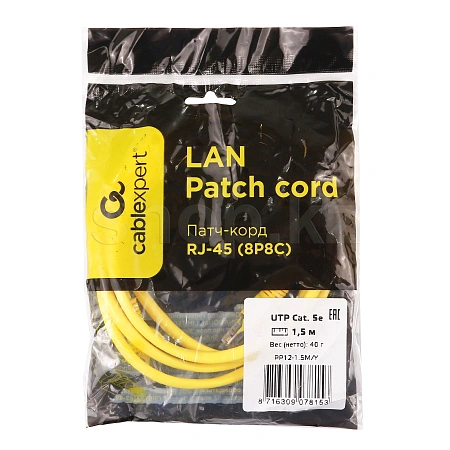 Patch cord RJ-45 5е cat Cablexpert PP12-1.5M/Y, UTP, 1.5m, Yellow