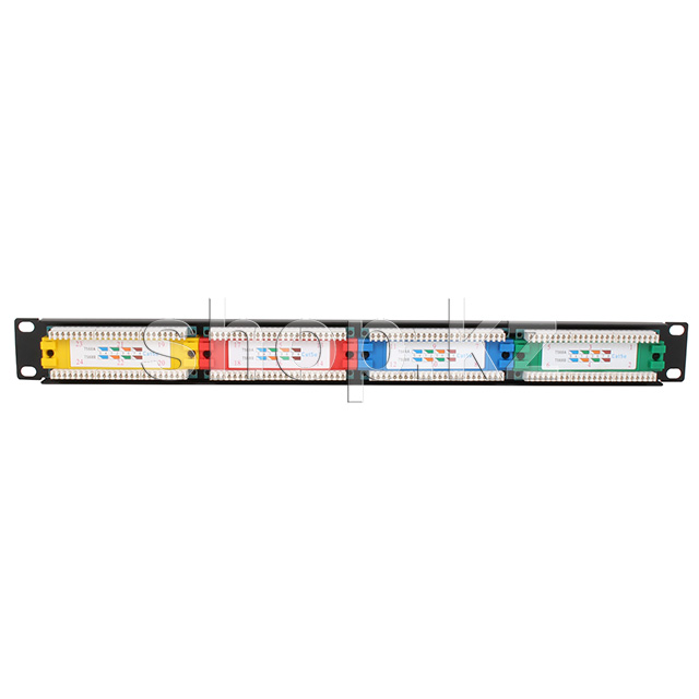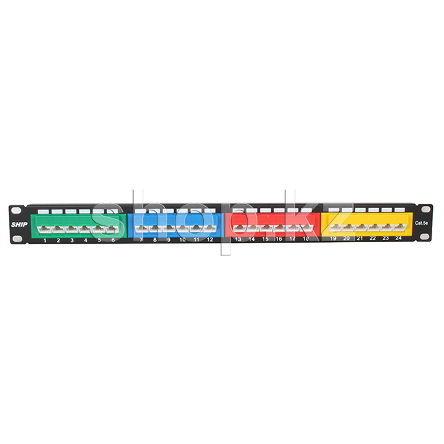 Коммутационная 24 портовая панель, необходимая для консолидации информационных кабелей этажной (горизонтальной) подсистемы СКС. Порты расположены под углом в 45 градусов а так же каждый из 4 блоков патч панели окрашен в свой цвет, что служит для удобства коммутации и администрирования СКС. Коммутационная панель (patch panel) состоит из 24 портов RG 45 с фронтальной стороны и разъемов DUAL IDC с тыльной стороны.