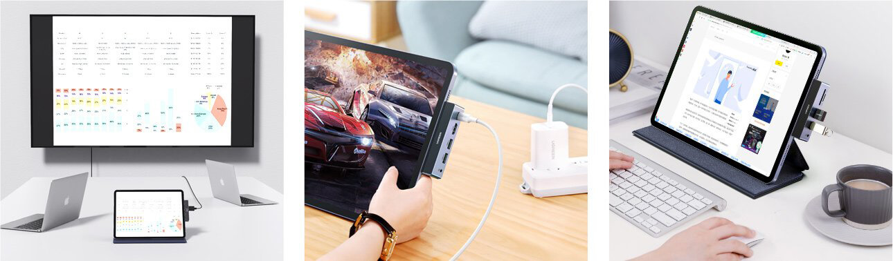 Концентратор UGREEN USB Type-C для iPad расширяется за счет видеовыхода 4K 60 Гц HDMI, порта для зарядки USB C PD мощностью 100 Вт, 2 портов USB 3.0 и аудиопортов 3.5 мм. Вы можете напрямую использовать его как компьютер для работы в домашнем офисе, семейного просмотра фильмов, прослушивания музыки. Отлично подходит для повышения эффективности вашей работы.