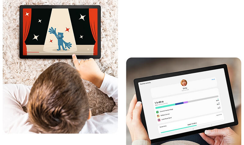 Детский режим Samsung Kids позволяет создавать безопасную среду для ваших детей. Просто нажмите на иконку Детского режима на Панели быстрого доступа и наслаждайтесь приложениями с персонажами, которые живут в виртуальном мире. Функция родительского контроля позволяет контролировать использование планшета и игровое время, поэтому вы спокойно можете передавать устройство детям.