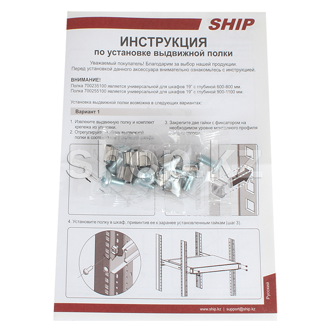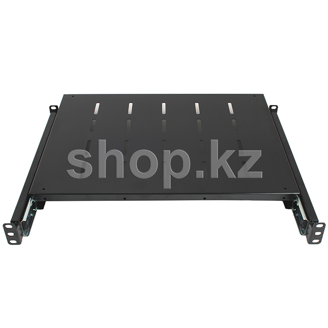 Полка имеет телескопические направляющие, обеспечивающие плавное выдвижение. Монтажные кронштейны фиксируют полку к вертикальным направляющим шкафов и стоек в четырех местах. Глубина монтажных кронштейнов регулируется, что позволяет устанавливать полку на необходимую глубину. Полка перфорирована для свободного прохождения охлаждающего воздуха.