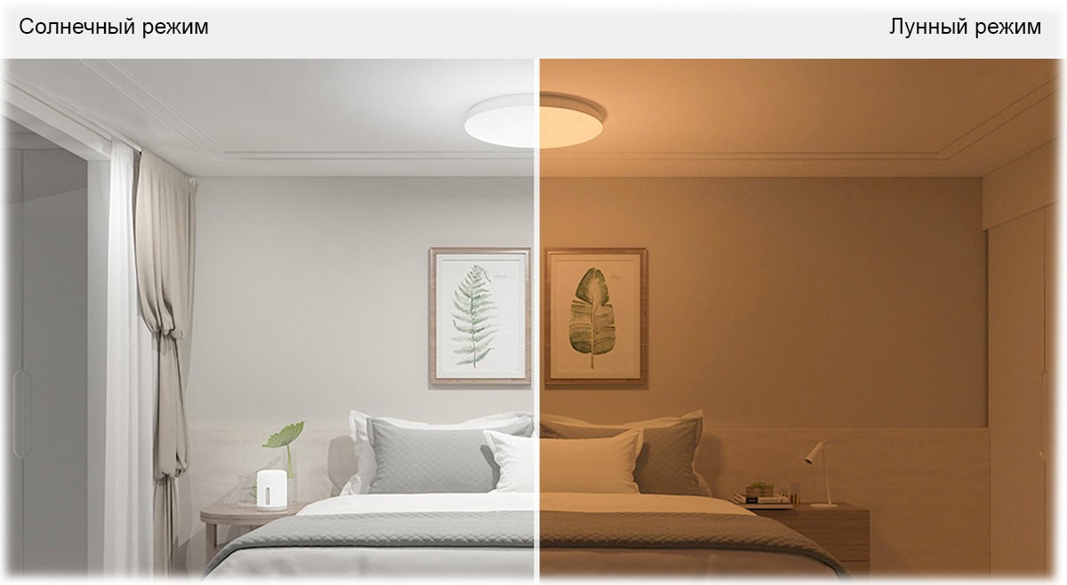 С помощью приложения MiHome можно свободно настраивать яркость и температуру света. В солнечном режиме светильник заливает ярким светом всю комнату, а в лунном режиме он издает мягкое и тусклое свечение, подобно настоящей луне.