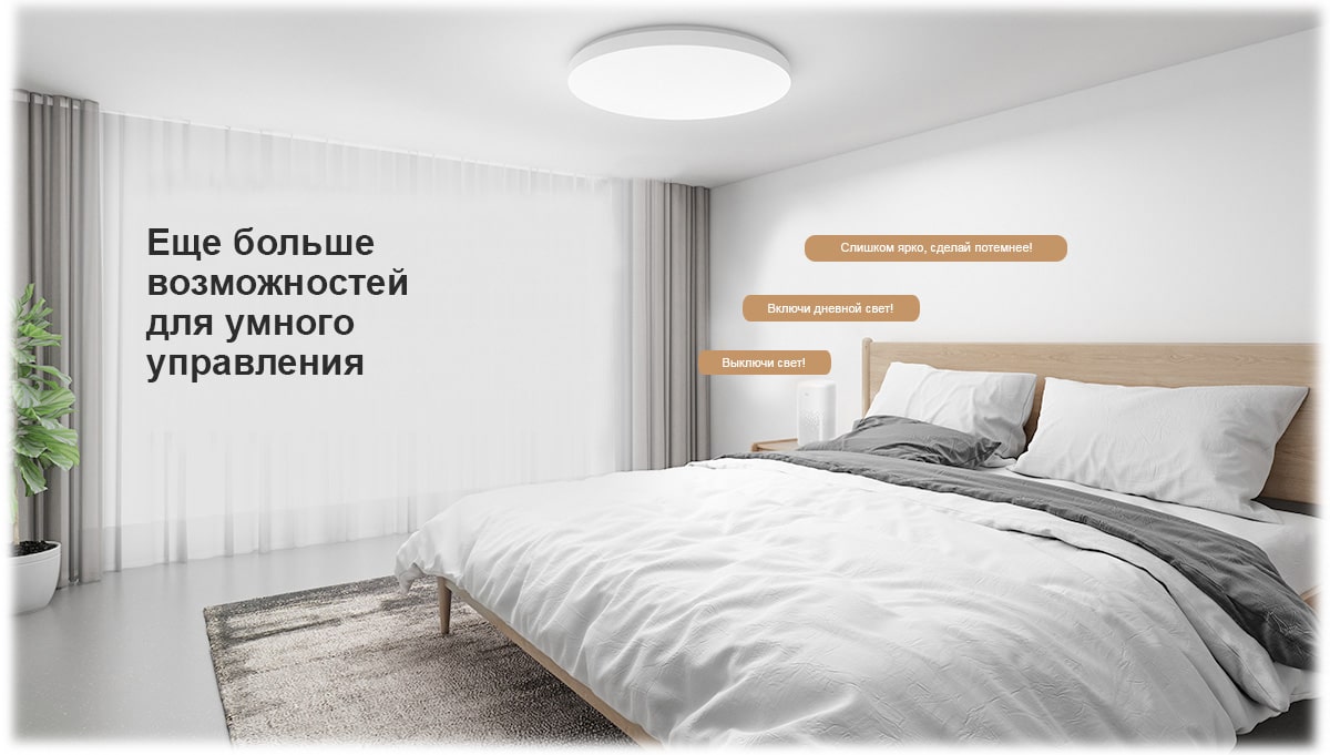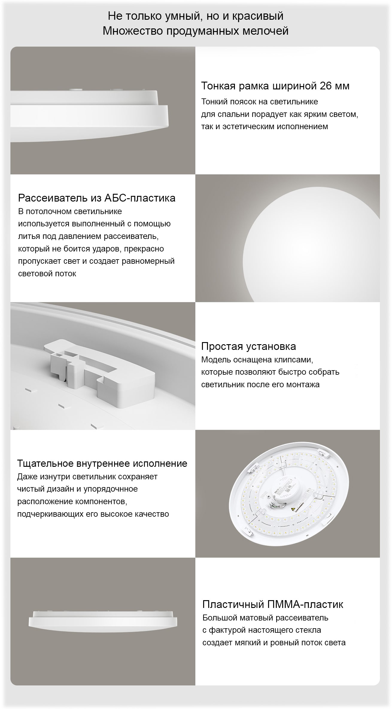 Рассеиватель потолочного светильника MiHome плотно прилегает к корпусу и не пускает внутрь ни пыль, ни насекомых, сохраняя внешнюю чистоту и высокую светопроницаемость. Светильник для гостиной оснащен цельным безрамочным рассеивателем, который доносит яркий свет до каждого уголка комнаты. Светильник для спальни имеет рамку шириной всего 26 мм, которая подчеркивает его современный дизайн и позволяет без труда вписаться в любой интерьер.