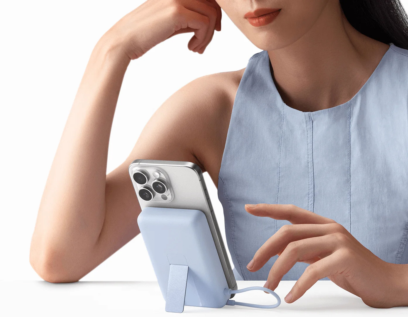 Стенд шамамен 80° дейін ашылады және қолыңызды босатып, смартфонға магнитті түрде бекітіледі. Кірістірілген кабельдің арқасында смартфонды пайдалану кезінде оңай зарядтауға болады.