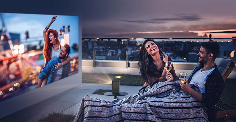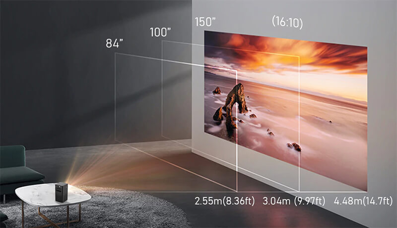 Проектор способен выводить изображение диагональю до 150 дюймов, но наиболее чёткая картинка получается с расстояния 2-х метров, размер проекции при этом составит 80 дюймов. Благодаря встроенным датчикам гаджет настраивает проекцию таким образом, чтобы она была всегда ровной прямоугольной формы без трапецеидальных искажений.