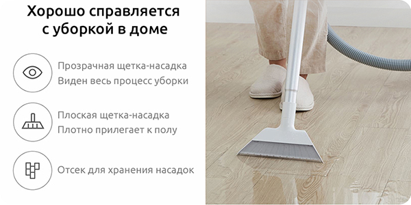 Плоская щетка-насадка предназначена для уборки таких жидкостей, как фруктовый сок, суп или соевый соус. Пылесос Deerma Vacuum Cleaner TJ200 – это еще один шаг к комфорту и безупречной чистоте.