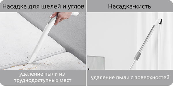 В комплекте также имеется насадка для чистки щелей и насадка-кисть. Щелевую насадку удобно использовать для чистки углов, подоконников и клавиатур. Насадкой-кистью можно удалять пыль с мебели и ткани.