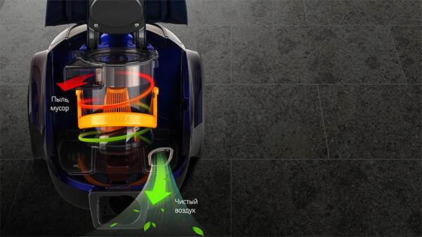 Благодаря особой форме эллипса обеспечивается высокая центробежная сила, которая концентрируется в узкой части эллипса и увеличивает мощность воздушного потока в широкой части эллипса, позволяя отделять даже микрочастицы пыли от воздуха.
