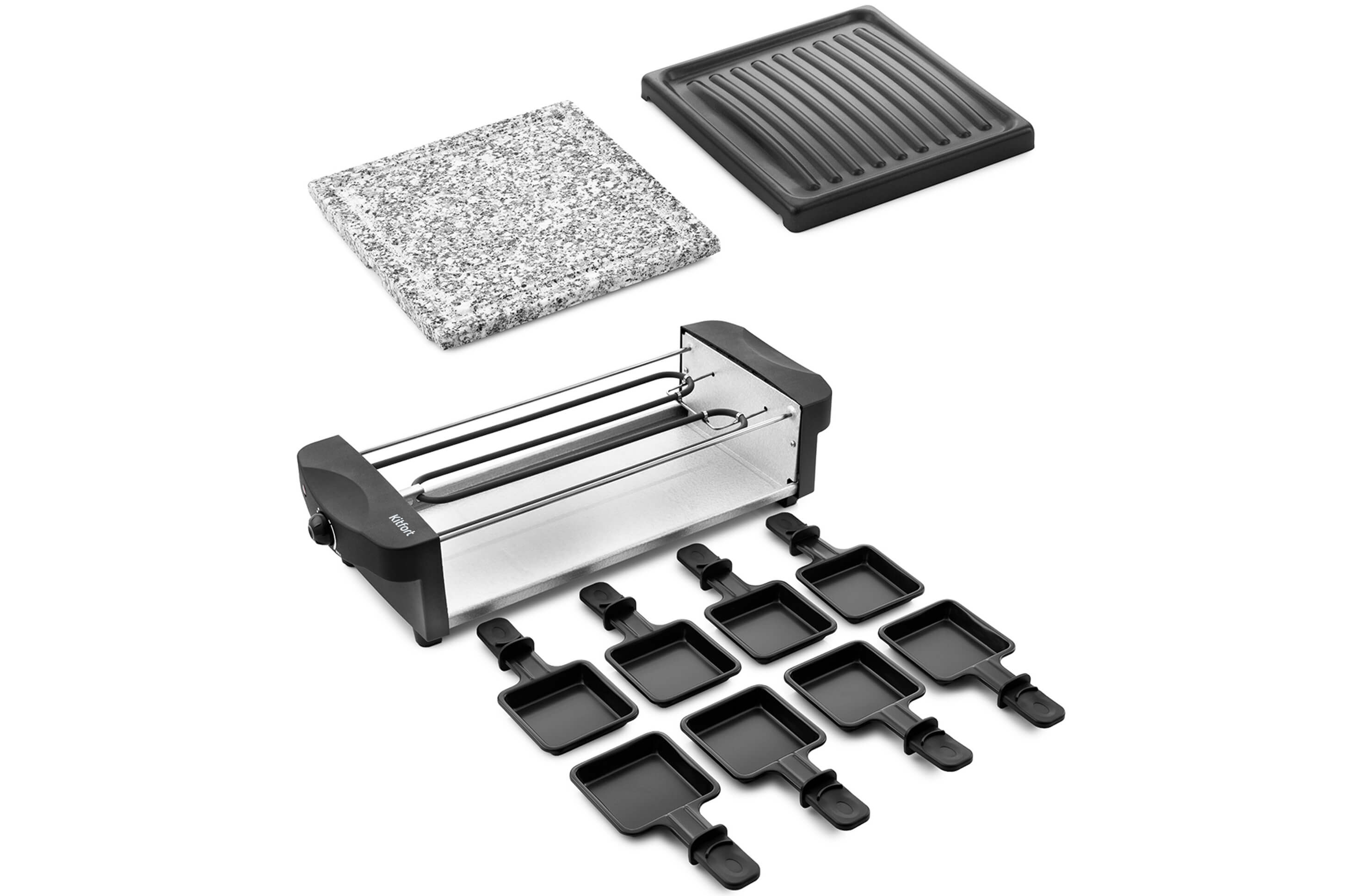 Устройство оснащено ТЭНом, под которым имеются специальные углубления для порционных сковородок для сыра. Сверху ТЭН закрывает панель, на которой можно обжаривать продукты. ТЭН раклетницы нагревает панель для гриля и расплавляет сыр в сковородках.