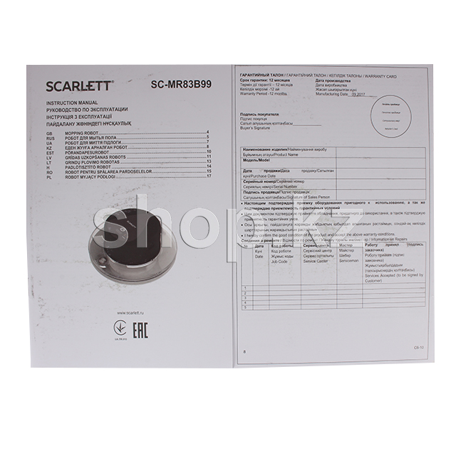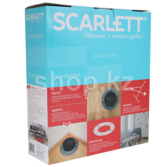 Робот для мытья пола Scarlett SC-MR83B99 надежный и эффективный помощник для уборки дома на каждый день! В кольцевой прозрачный контейнер для воды 0.26 л можно добавить моющие средства для мытья пола. Благодаря специальным клапанам, вода постепенно подается на фибра-ткань установленную снизу прибора.