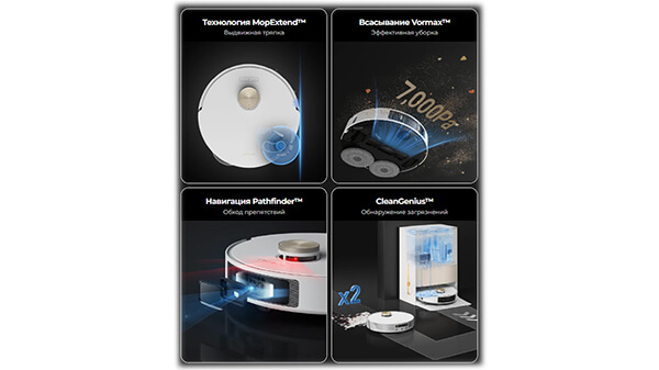 Робот-пылесос оснащен двумя круглыми моющими насадками с функцией нажатия на пол. За счет продуманной конструкции выдвижной насадки робот качественно убирает даже по краю плинтуса. За автономность пылесоса отвечает встроенный аккумуляторный блок емкостью 6400 мА*ч. Встроенная поддержка технологии быстрой зарядки ускоряет процесс на 30%.