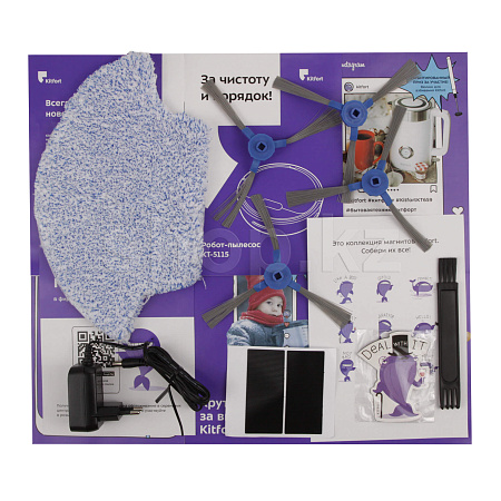 В комплекте всё необходимое для уборки: пылесборник, боковые щётки, фильтр грубой и тонкой очистки, зарядное устройство, тряпка для влажной уборки и щёточка для чистки.