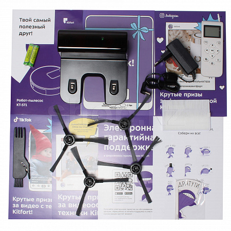 Робот-пылесос Kitfort КТ-571 принадлежит к новой серии роботов-пылесосов. Он вобрал в себя все современные наработки в этой области: датчики препятствий и поверхности, увеличенный объём пылесборника, литиевый аккумулятор, НЕРА-фильтр, простоту управления.