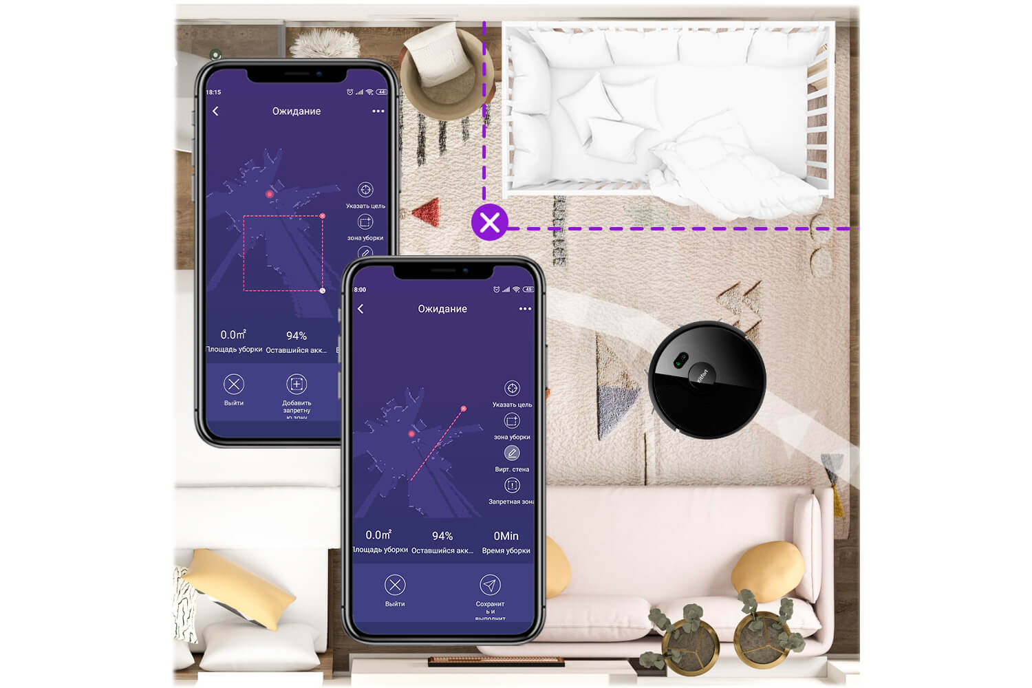 В мобильном приложении WeBack вы можете обозначить виртуальную стену, которую робот не будет пересекать во время уборки. При установке запретной зоны робот не будет заезжать внутрь обозначенного участка.