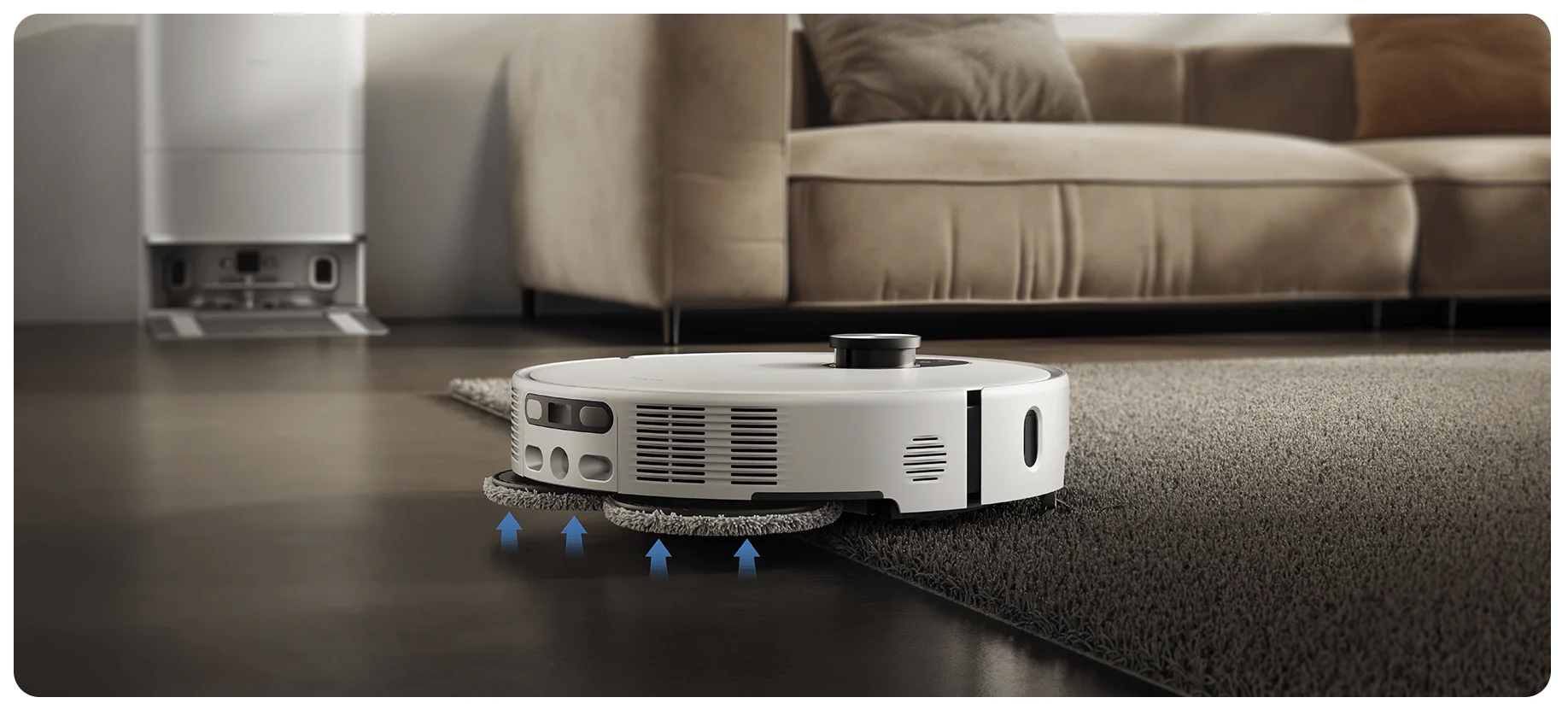 Умная выдвижная боковая щетка и насадка для влажной уборки автоматически выдвигаются, очищая пыль вдоль стен и в углах с точностью до миллиметра. В сочетании с отдельным резервуаром для воды и точным регулированием подачи воды, полы остаются идеально чистыми.
