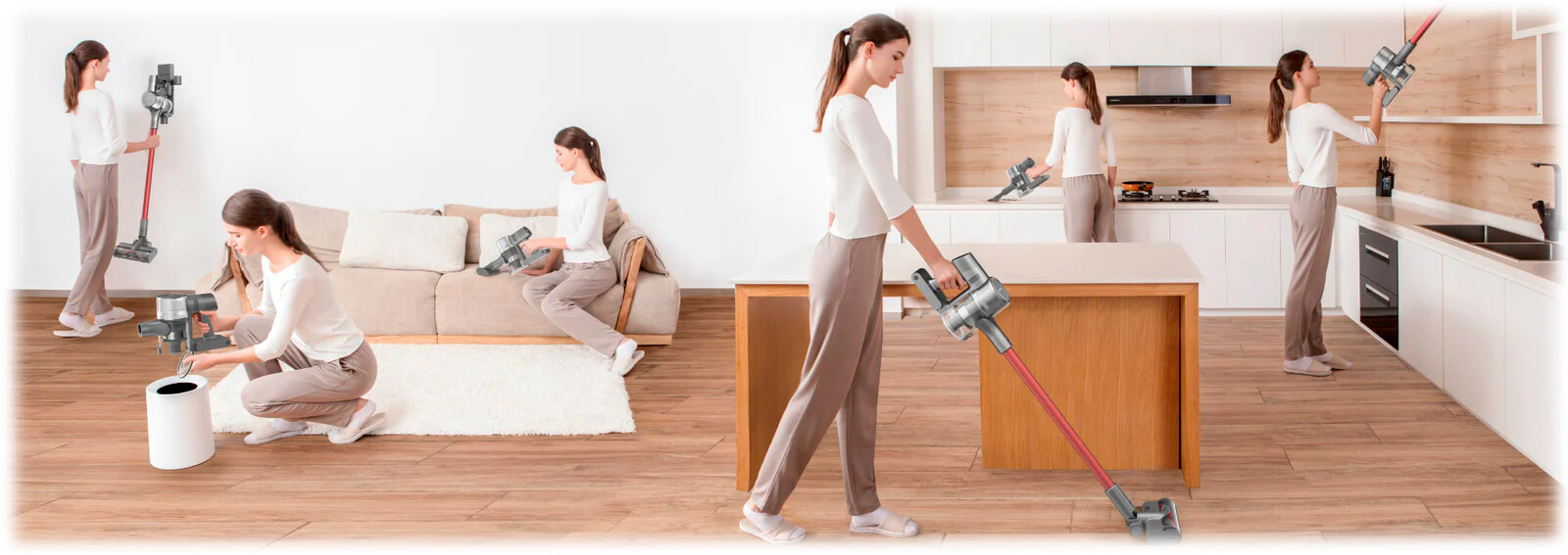 Глубокая уборка большого дома на полной зарядке с помощью различных насадок, поставляемых вместе с T20.